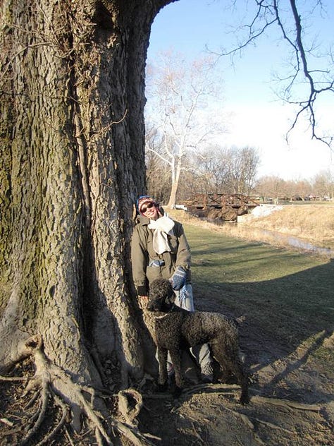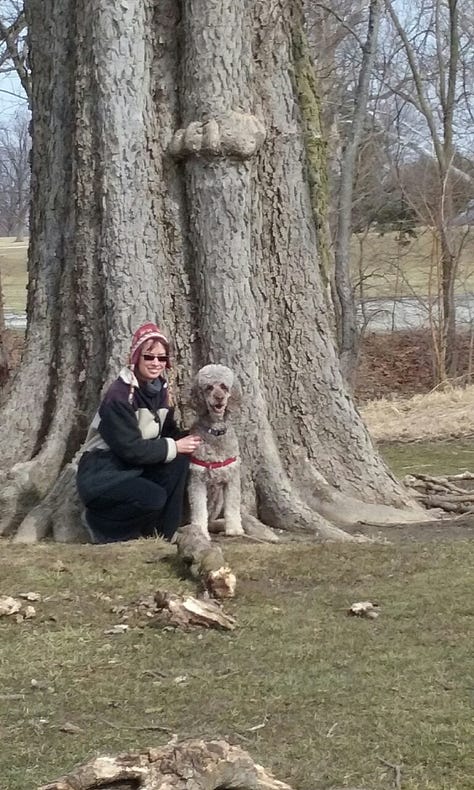 —the tree under which her predecessor, Marley, self-soothed during frenetic dog club moments by shredding up sticks, later to poop out wood shards